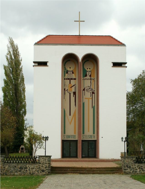 Die katholische Sankt Elisabeth-Kirche zu Ballenstedt, die Anfang der 30-iger Jahre im Zeitgeist des Bauhauses von Josef Arnold entworfen wurde, lässt im Blick auf das Kirchenportal schon seine theologische Grundkonzeption aufscheinen: Glaube, Hoffnung und Liebe. Für die Liebe im Dienst am Nächsten steht die Patronin der Kirche, die Heilige Elisabeth mit ihrem Korb voller Rosen, der hinweist auf das legendäre „Rosenwunder“. Für den Glauben steht der Heilige Bonifatius , Missionar und Apostel der Deutschen, an dessen Grab in Fulda sich regelmäßig die Deutschen Bischöfe zu ihren Beratungen treffen. Für die Hoffnung steht das Kreuz, das den Glockenturm der Kirche krönt.