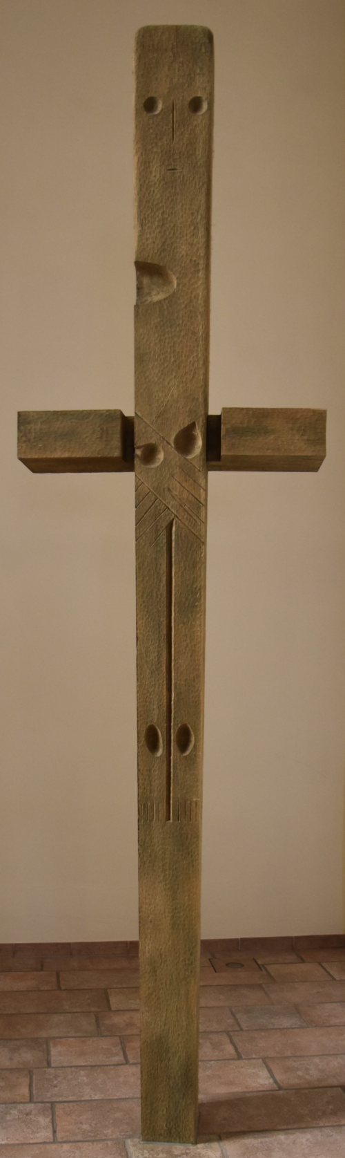 Dieses Holzkreuz, das den Altarraum eindeutig dominiert, wurde 1973 von dem Dresdner Künstler Friedrich Press gestaltet. Es steht unter dem Thema „Durch das Kreuz zur Auferstehung“. Zu seinem Werk sagte der Künstler selbst: „Sie werden verstehen, dass ich diesen Gedanken nicht realistisch darstellen kann. Ich glaube, darüber brauche ich nicht zu sprechen. Hier sind Glaube und Wirklichkeit eng zusammen. Christus ist auferstan- den, das Kreuz aber bleibt. So habe ich das Kreuz stärker betont, die Gestalt Christi im Längsbalken nur leicht angedeutet. Den Längsbalken im oberen Teil überhöht, um das Aufstreben zu betonen. Stark hervorgehoben sind nur die Augen und die Herzwunde („Herz Jesu“). Auch dieses Thema nicht mehr in der uns von früher bekannten Form. Ich überlasse es bei all meinen Arbeiten dem Beschauer, sich selbst mit der Form und der Idee auseinanderzusetzen. Es ist nicht leicht und wird auch nicht jedem sofort gefallen. Gefallen kannman schon gar nicht sagen, denn wie kann ein Kreuz gefallen? Ich bin über 50 Jahre in meinem Beruf und bei jeder Arbeit, bei jedem Kruzifix stehe ich vor neuen Aufgaben. So kann ich gut verstehen, dass die Beschauer nicht alle sofort meine Gedanken verstehen und ja sagen. Die Erfahrung aber zeigt mir in allen Kirchen, dass meine Arbeit die Gemeinde herausfordert, sich mit ihr zu befassen. Und damit habe ich sehr viel erreicht. Ich würde mich freuen, wenn ich in einiger Zeit von Herrn Pfarrer Roeren hören würde, dass auch hier die Gemeinde meine Arbeit angenommen hat."