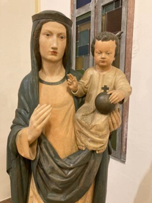 Die Madonna mit Kind gehört zur Grundausstattung der Kirche. 1939 gearbeitet vom Bildhauer Julius Mormann aus Wiedenbrück hat sie den 2. Weltkrieg und die DDR-Zeit überstanden und steht in der Kirche mit ihrem Angebot, unsere Anliegen vor Gott, den Vater zu tragen. Nehmen sie sich die Zeit, vor dem Verlassen der Kirche eine Kerze zu entzünden und auf diese Weise ihrem Gebet Ausdruck zu verleihen.