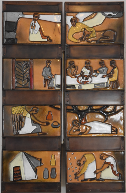 Der Tabernakel vorn auf der linken Seite wurde im Jahr 1961 neugestaltet. Die Tabernakeltüren sind aus Emaille gearbeitet und stellen Szenen aus dem Alten Testament dar, die alle hinweisen auf das Geheimnis der Eucharistie, das lebendige Brot, den Leib Christi, der im Tabernakel aufbewahrt wird.