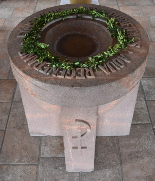 Der Taufstein am Eingang zum Kirchenraum erinnert an unseren „Eintritt“ in die Kirche durch das Taufsakrament.Dessen Inschrift „Fons vivus +unda purificans + Aqua regenerans“ bedeutet soviel wie: „Lebendiger Quell + reinigende Welle + Wasser der Wiedergeburt"